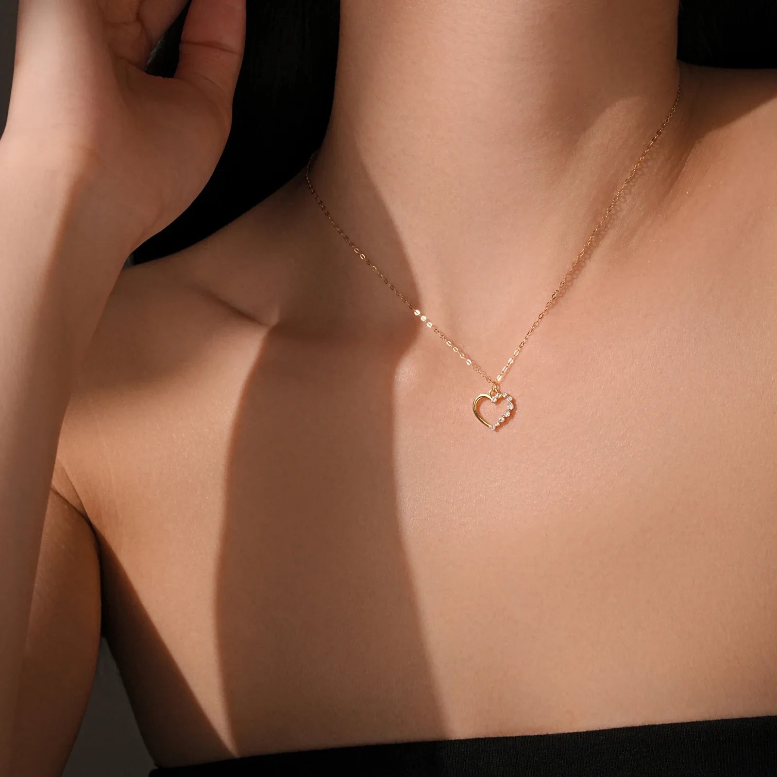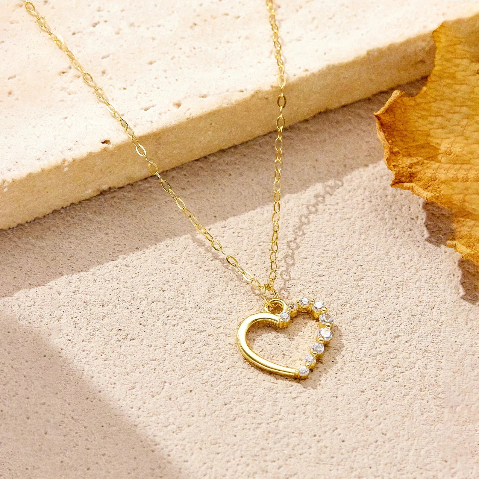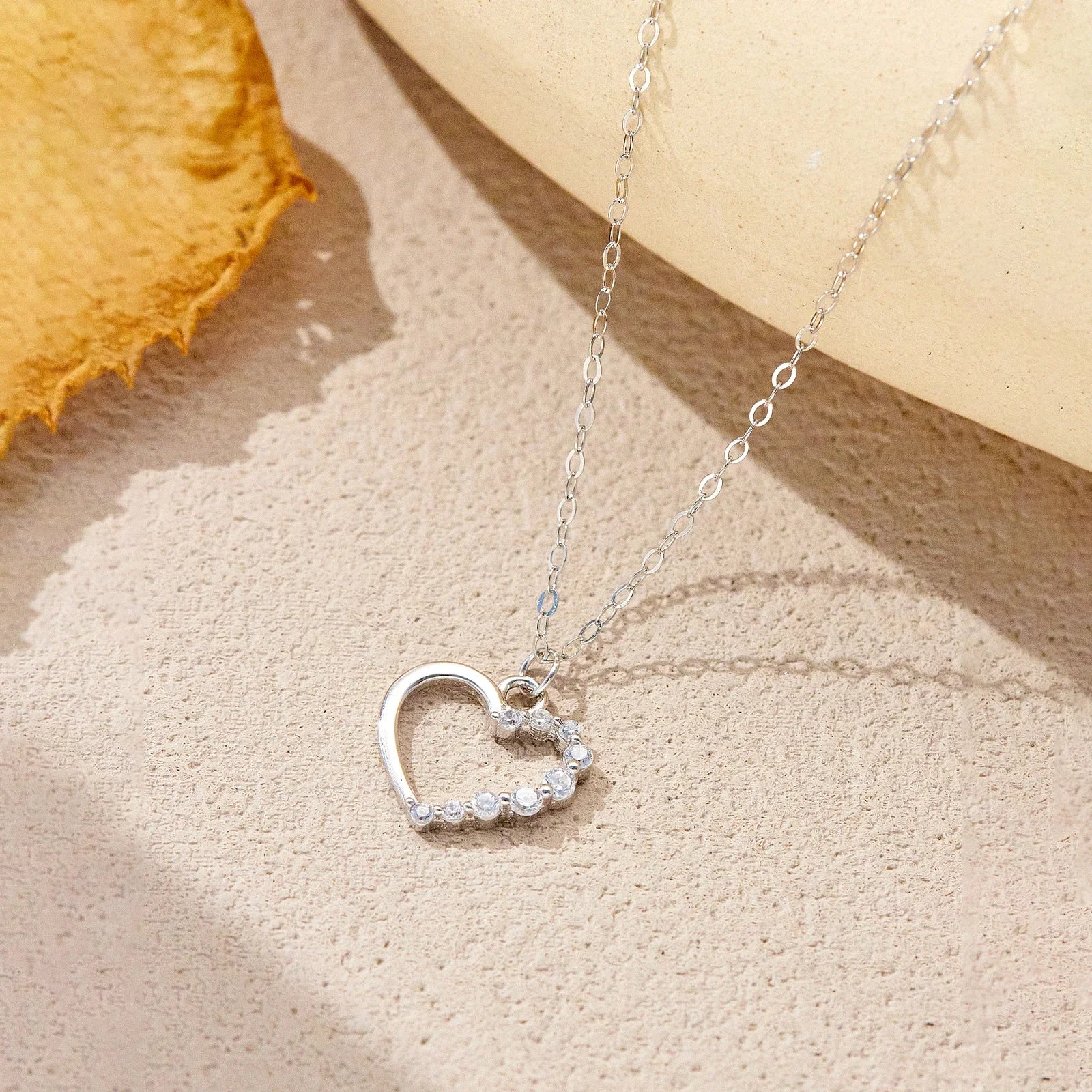 Handcrafted from premium 925 sterling silver, this delicate design features a heart-shaped openwork pendant adorned with sparkling cubic zirconia, paired with a graceful side stone that adds a subtle yet captivating brilliance.