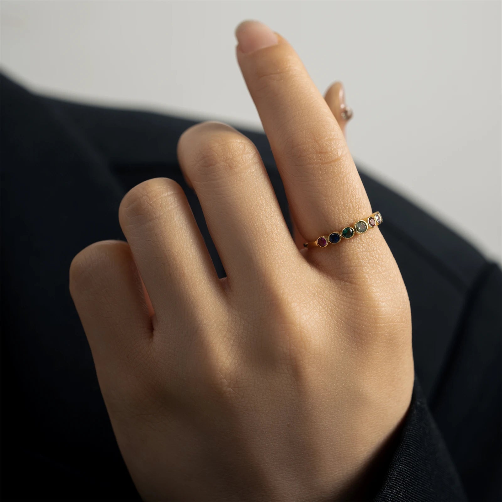 The Solvana Rainbow cz (cubic zirconia) Circle Ring blends artistic color with minimalist sophistication.